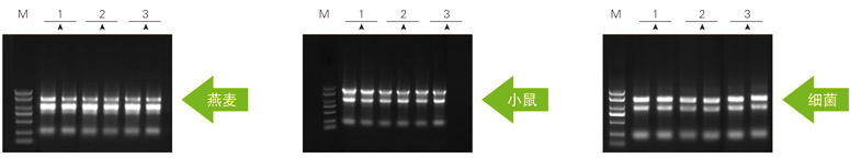以上參考圖分別取50mg燕麥葉片,20mg小鼠肝臟和1ml細菌DH5α菌液各數(shù)份,組織進行液氮研磨處理,菌液離心收集細胞后,分別加入1ml Zomanbio RNApure 和 T、I公司相應產(chǎn)品,按各自說明書進行RNA提取。洗脫體積分別為80μl、100μl、60μl。RNA電泳上樣量分別為5μl,1%瓊脂糖凝膠電泳。