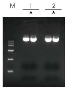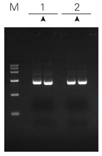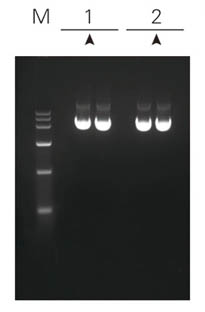 注解:PUC19質(zhì)粒 菌液OD600=1.530 1:ZP101 2:ZPK101 M:莊盟DNA MarkerⅥ(5μl點(diǎn)樣) Marker與樣品均為5μl點(diǎn)樣 | 注解:PET-15B質(zhì)粒(中低拷貝) 菌液OD600=1.824 1:ZP101 2:ZPK101 M:莊盟DNA MarkerⅥ(5μl點(diǎn)樣) Marker與樣品均為5μl點(diǎn)樣 | 注解:8K質(zhì)粒 菌液OD600=1.167 1:ZP101 2:ZPK101 M:莊盟DNA MarkerⅥ(5μl點(diǎn)樣) Marker與樣品均為5μl點(diǎn)樣 | 注解:15K質(zhì)粒 菌液OD600=1.553 1:ZP101 2:ZPK101 M:莊盟DNA MarkerⅥ(5μl點(diǎn)樣) Marker為5μl樣品為2μl點(diǎn)樣 |