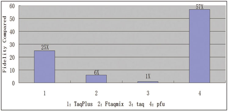 | 更高的保真性 保真性高于普通Taq DNA聚合酶25倍。( LacZ測(cè)定法 ) | ![]() |