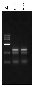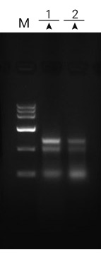 → | 1%瓊脂糖凝膠電泳 1:89.2mg小麥莖 2:101.4mg馬鈴薯莖 洗脫體積:小麥莖、馬鈴薯莖100ul RNA電泳上樣量:5μl M:DNA MarkerⅥ(ZOMANBIO) |