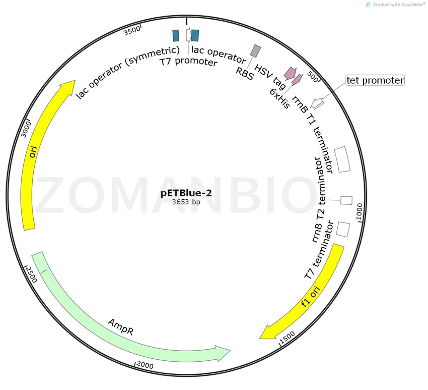 pETBlue-2是一個(gè)大腸桿菌pET系列表達(dá)質(zhì)粒。The pETBlue?-2 vector is designed to identify recombinants by traditional blue/white screening while also allowing T7lac promoter based expression of target genes. Screening is independent of expression because the T7lac expression promoter is in an opposed orientation relative to the E. coli promoter that mediates blue/white screening. pETBlue-2 defines the open reading frame and inserts must be cloned in-frame if expression is desired. The vector features an expanded multiple cloning site (MCS) and optional C-terminal HSV?Tag? and His?Tag? sequences. The sequence is numbered from the first base of the T7 promoter sequence.