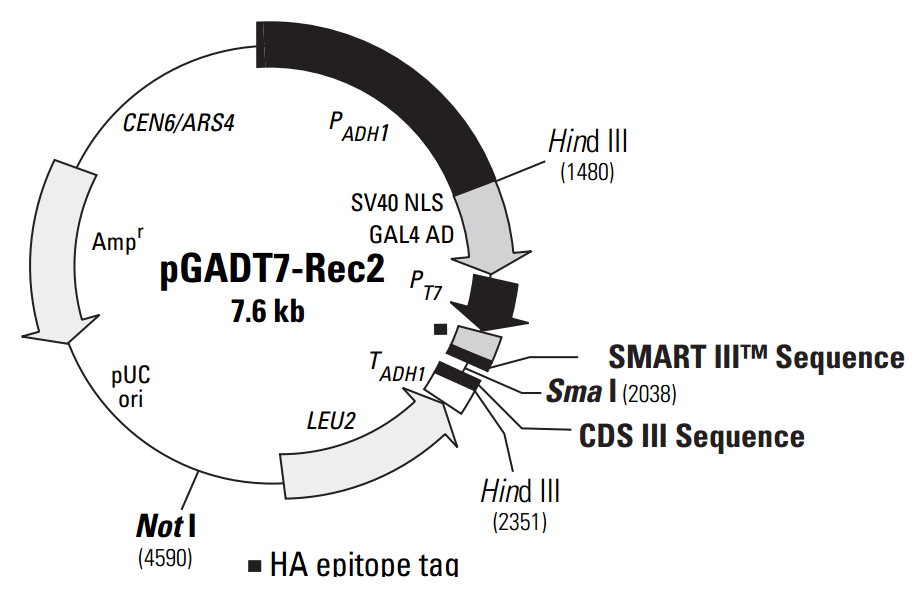 pGADT7-Rec2 is a cloning vector that can be used in yeast to express a protein of interest as a GAL4 activation domain (GAL4 AD) fusion. Transcription starts with the constitutive ADH1 promoter (PADH1) and ends with the ADH1 termination signal (TADH1). The GAL4 AD sequence includes the SV40 nuclear localization signal (SV40 NLS; 1) so that fusions translocate to the yeast nucleus. GAL4 AD fusions also contain a hemagglutinin (HA) epitope tag. The T7 promoter in pGADT7-Rec2 can be used for in vitro transcription and translation of the HA-tagged fusion protein. It also provides a binding site for sequencing with the T7 Promoter Sequencing Primer.