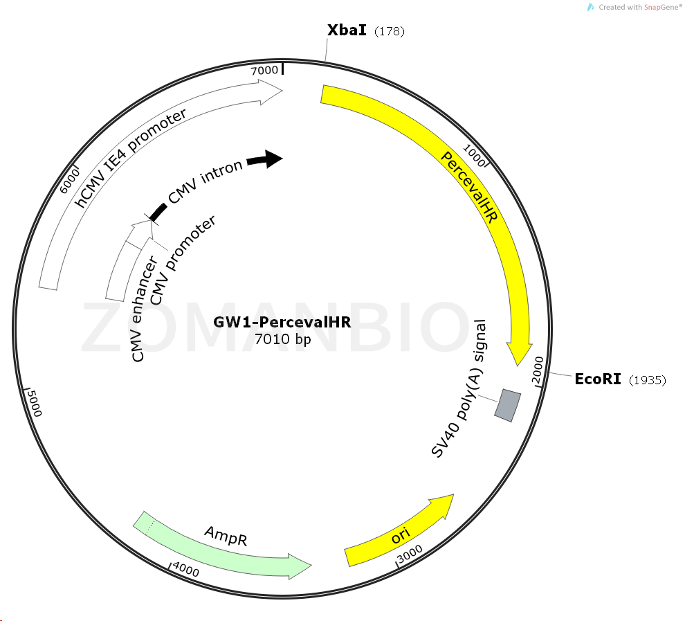 GW1-PercevalHR質(zhì)粒通過hCMV IE4 啟動(dòng)子驅(qū)動(dòng)PercevalHR基因的表達(dá),Mammalian expression vector (CMV promoter) of PercevalHR, a fluorescent sensor of ATP-to-ADP ratio.