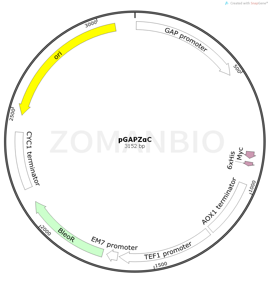 pGAPZ A,B,和C載體(2.9 KB)和pGAPZαB和C(3.1 KB)載體使用GAP啟動(dòng)子在畢赤酵母中穩(wěn)定表達(dá)重組蛋白。重組蛋白表達(dá)為為帶有C-末端myc抗原表位和C端His標(biāo)簽的融合蛋白。此外,pGAPZα 表達(dá)的融合蛋白在N-端帶有釀酒酵母(Saccharomyces cerevisiae)的α-因子分泌信號(hào)肽。這兩個(gè)系列的載體都提供三個(gè)不同讀碼框的載體,以方便克隆的帶有C-端標(biāo)簽和/或N-末端分泌信號(hào)肽的載體中。