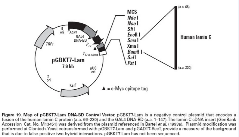 pGBKT7-Lam is a negative control plasmid that encodes a fusionof the human lamin C protein (a.a. 66–230) and the GAL4 DNA-BD (a.a. 1–147). The lamin C cDNA insert (GenBank Accession #M13451) was derived from the plasmid referenced in Bartel et al. (1993a). Plasmid modification was performed atBD Biosciences Clontech. Yeast cotransformed with pGBKT7-Lam and pGADT7-RecT, provide a measure of the backgroundthat is due to false-positive two-hybrid interactions. pGBKT7-Lam has not been sequenced.