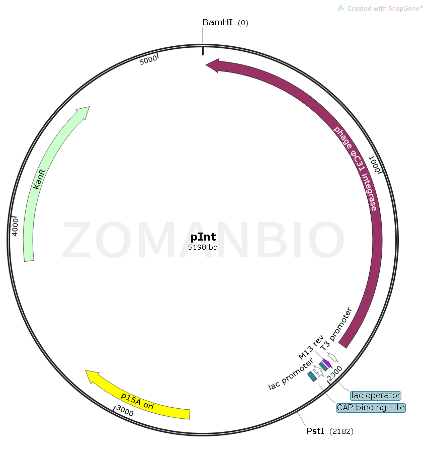 pInt質(zhì)粒提供提供鏈霉菌噬菌體phiC31基因,其參考文獻(xiàn):A phage integrase directs efficient site-specific integration in human cells.
