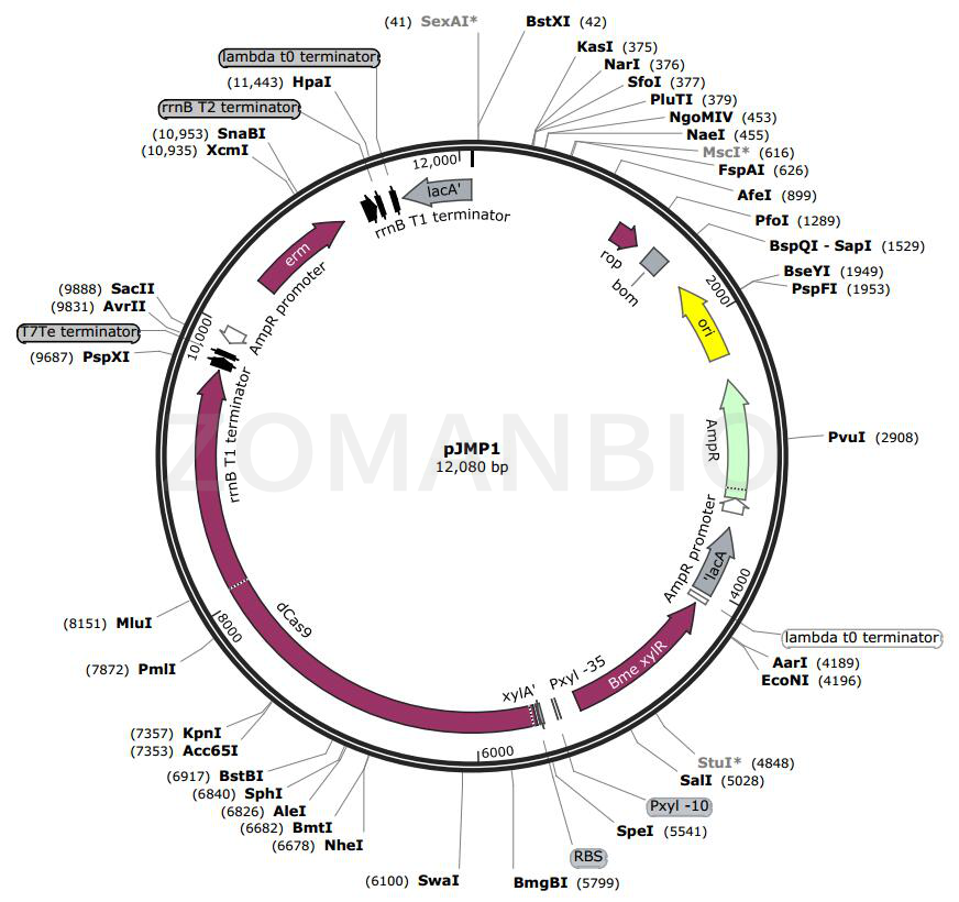 pJMP1質(zhì)粒是一個枯草桿菌基因編輯質(zhì)粒。Bacillus subtilis dCas9 expression vector; integrates into lacA/ganA。dcas9 was PCR-amplified from pdCas9-bacteria (Addgene #44249) using primers containing BamHI-compatible BsaI sites, digested with BsaI, then ligated into plasmid pAX01 digested with BamHI to generate pJMP1。